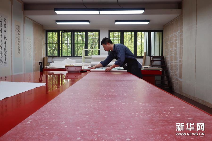 5月13日,古籍修復(fù)師在對書畫作品進(jìn)行裝裱操作。
