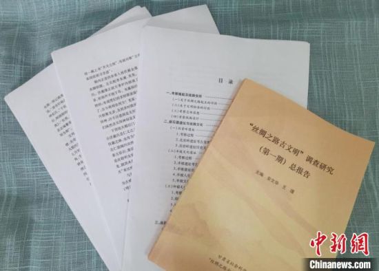 7月下旬,甘肅省社會科學院工作人員展示《絲綢之路古文明》第一階段考察報告打印版。 閆姣 攝
