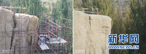 敦煌研究院古代壁畫與土遺址保護(hù)創(chuàng)新團(tuán)隊承接的新疆交河故城崖體加固項目前后效果對比(資料圖)。敦煌研究院 供圖