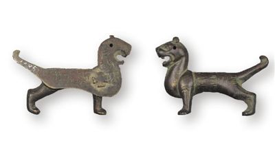 銅虎符(圖③)高4.7厘米、長(zhǎng)6.9厘米?;A豎耳,怒目張口,挺胸昂首,尾上翹,作奔走狀。符頭部有圓穿孔,背面有凸起的十字扣。符身正面陰刻篆書“永安府”字樣,背面陰刻楷書“右翊衛(wèi)”“右驍衛(wèi)”“永安四”“蘭豐二”等字樣。右翊衛(wèi)、右驍衛(wèi),官署名,為隋唐十六衛(wèi)中的兩衛(wèi)。隋初稱左右衛(wèi),隋煬帝時(shí)改為左右翊衛(wèi),所領(lǐng)軍士稱驍騎。館藏虎符出土于甘肅莊浪,是隋代府兵駐防莊浪的歷史見證,是研究隋代府兵制度的重要實(shí)物資料。