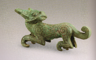 禮縣大堡子山祭祀樂(lè)器坑出土,共三只,造型相同,大小相似,為全國(guó)虎伴樂(lè)器出土的首例。其形象回首卷尾、聳耳曲爪、憨態(tài)可掬,極具觀賞性,是春秋時(shí)期虎造型的杰作,體現(xiàn)了秦國(guó)早期高超的造型能力和精湛的鑄造技術(shù)?;⒌男蜗笤诖呵锴厝说钠魑镏卸嘁?,不但有自成個(gè)體的金虎、青銅回首虎,同時(shí)虎作為附飾也出現(xiàn)在一些大的青銅器上。
