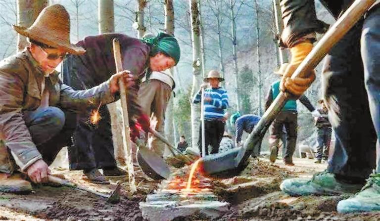 形狀神似燕尾的鏵,并非是由工匠在傳統(tǒng)的鐵匠鋪里鍛打而成,要知道,雍壩人的犁鏵生產(chǎn)場地頗具規(guī)模——村頭江邊的空地變成了一個偌大的生產(chǎn)車間,幾百人集體出動、密切協(xié)作,機(jī)器轟鳴,爐火升騰,進(jìn)料的、揚(yáng)爐的、撥碴的、取火的、出鏵的……男女老少齊上陣,吃飯喝水在工地,這樣熱鬧而忙碌的勞動場景頗為壯觀。