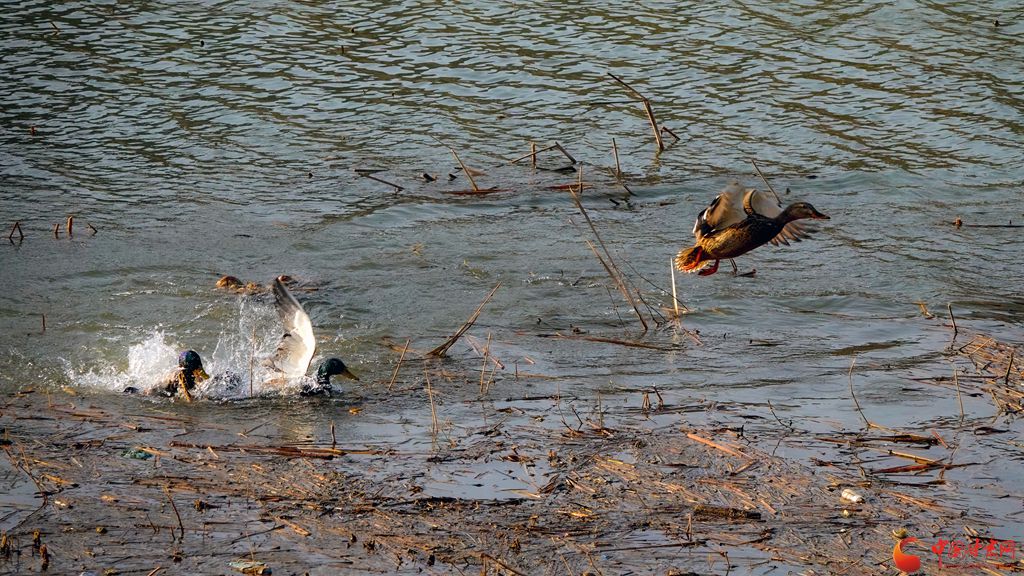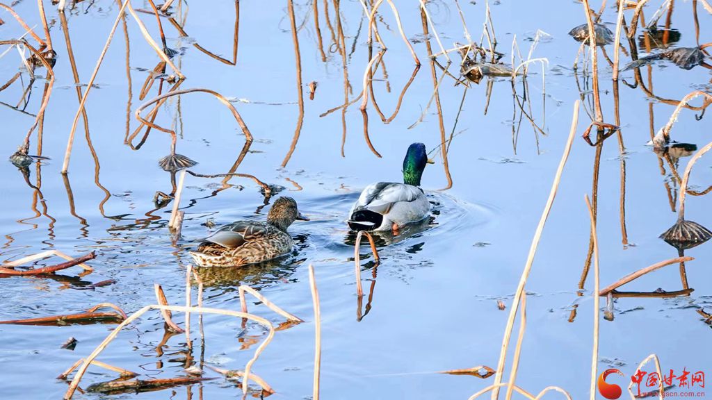 冬日的崇信縣龍澤湖,枯殘的荷葉、蓮蓬與枝干倒映水中,一株株枯荷挺著一身風(fēng)骨靜靜地佇立在湖中,鳳頭鸊鷉、鴛鴦、秋沙鴨、赤麻鴨等成群結(jié)隊的候鳥在枯荷間嬉戲,舞出了不一樣的冬韻。