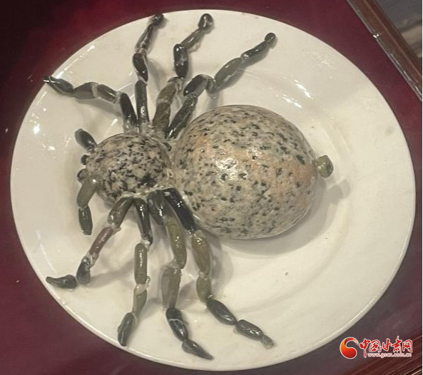 兩個花紋沒啥特點、一大一小的圓形石頭,再加上更細(xì)小的石粒,竟然被創(chuàng)作者粘連起來,打造成了一只“蜘蛛”,惟妙惟肖。