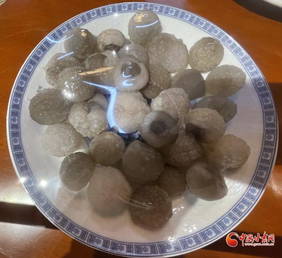 最令我過目難忘的是“中華百家宴”,我曾經(jīng)在其他地方的玉器展上看到過“滿漢全席”,而玉器大多經(jīng)打磨雕琢,太過匠心。臨洮洮河石文化博物館的這桌“中華百家宴”,則基本是石頭原貌,在大自然的雕琢下呈現(xiàn)出獨特的形態(tài),更顯奇特曼妙。一碟碟的“珍饈佳肴”上覆保鮮膜,有剛剝了殼的軟嫩荔枝,有點綴著紅辣椒綠蔥花的連皮燉肉塊,有表面起酥的炸肉串......看在眼里就覺鮮香可口,令人垂涎欲滴。若不是隔離繩攔著,若不是每個碗碟上都有保鮮膜蓋著,看到忘乎所以,若是拿起筷子夾一塊大快朵頤,滿嘴牙怕要分崩離析。
