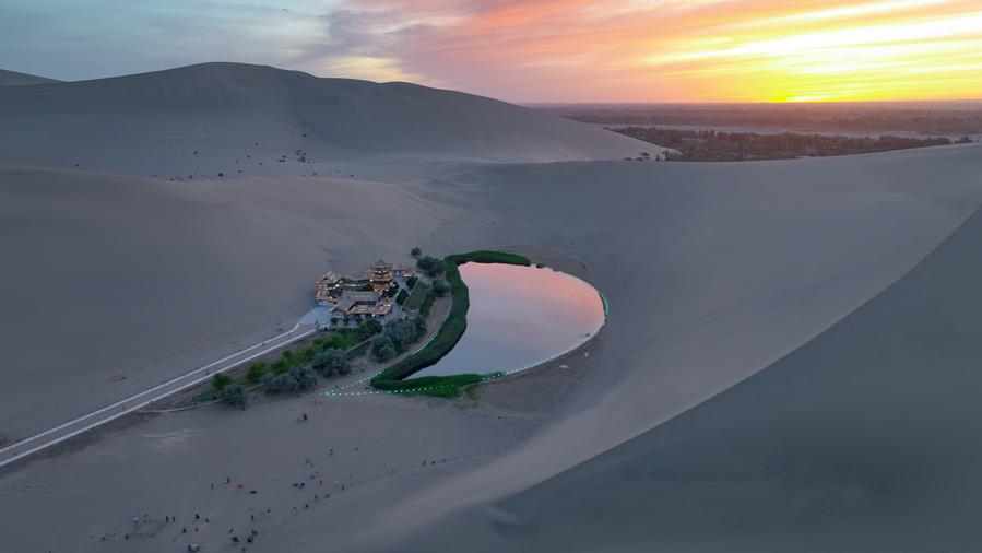 這是6月6日拍攝的鳴沙山月牙泉(無(wú)人機(jī)照片)。新華社記者 郎兵兵 攝