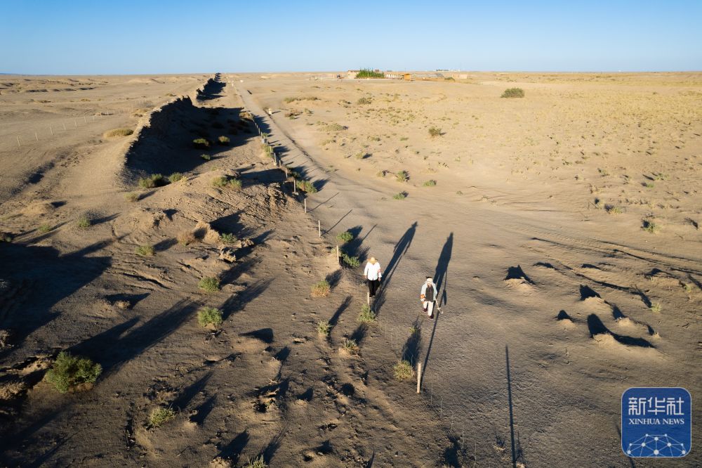↑這是張吉全和聞春瑜夫婦負(fù)責(zé)巡護(hù)的一段漢長城遺址(7月16日攝,無人機(jī)照片)。