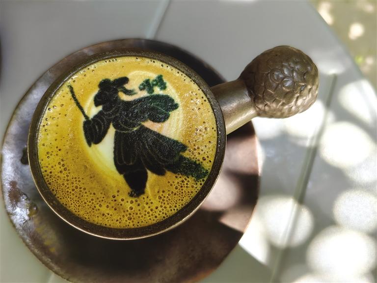 驚喜還有很多,就像店內(nèi)柜體上的一句話“可以讓大家體會到我們不一樣的用心”,這些年輕人用心起來還真能撬動地球。飲品和咖啡,設(shè)計團(tuán)隊愣是把口味和地域文化結(jié)合起來,整出了幾款“限量版”:城市限定——沙橙暴飲品,西北特有;特調(diào)咖啡——苦水玫瑰特調(diào),讓人一口難忘之余還配上了臺詞,“苦水玫瑰有點甜”;“文物咖啡”更是占據(jù)“C位”,咖啡拉花機“印制”而成的微縮版銅奔馬、蛙紋罐、銅車馬等文物圖案浮在濃郁的咖啡上,精致、唯美。這還不算,咖啡器皿的名稱也非同尋常——鷹首權(quán)杖杯。陶瓷來自景德鎮(zhèn),手柄是省博鷹頭形青銅權(quán)杖首的文物原型。驚嘆、贊美、感慨,每一位品嘗之人喜愛之余竟不忍飲用。