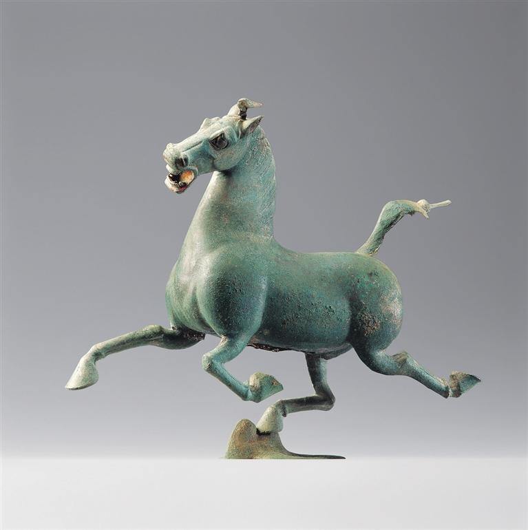 銅奔馬,東漢,1969年武威市雷臺墓出土。馬作奔騰狀,三足騰空,右后蹄踏一展翅飛翔、回首驚顧的飛鳥。奔馬全身著力點集于超掠飛鳥的一足之上,準(zhǔn)確地把握了力學(xué)平衡。蹄踏飛鳥,表現(xiàn)出馬行迅疾,在鳥驚回首的剎那已經(jīng)超越了飛行的鳥。銅奔馬鑄造精美,構(gòu)思巧妙,為我國青銅藝術(shù)中罕見的杰作,1983年被確定為中國旅游標(biāo)志,2002年被國家文物局列入首批禁止出國(境)展覽文物目錄。它以卓絕的藝術(shù)造詣千古生輝,成為中華民族勇往直前、積極進取偉大氣質(zhì)的象征。