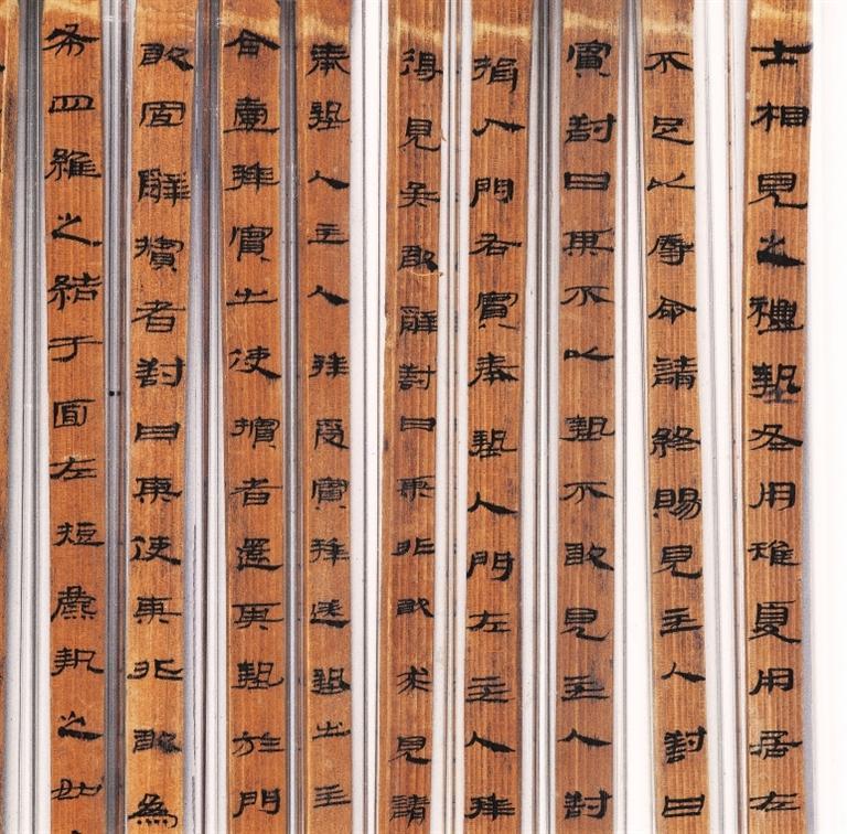 《儀禮》簡,西漢,武威磨嘴子出土。分木質(zhì)和竹質(zhì)兩種,共496枚,編為甲、乙、丙三本,系先編后寫。甲本為《儀禮》17篇中的7篇,乙本僅存《服傳》一篇,丙本僅存《喪服》一篇。該簡冊保存基本完好,與傳世的鄭玄注本不同,應(yīng)是目前所見《儀禮》的最古寫本,在版本校勘上有很高的價值,且書寫工整秀麗,是漢代墨寫隸書的上品。