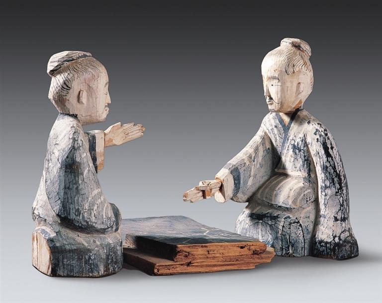 彩繪木六博俑,西漢,武威磨嘴子出土。木俑為兩位跪坐對局的老者形象,二者間設(shè)一長方形棋盤。老者神情凝滯,蓄勢待發(fā),顯然正在緊張的六博對局之中??脊虐l(fā)現(xiàn)中不乏漢代博局、棋子、骰子等六博器具,漢墓畫像磚中也常見相關(guān)圖像,但以雕塑刻畫六博對局卻極為罕見,這件文物充分體現(xiàn)了漢代木雕藝術(shù)所達到的高度與境界。