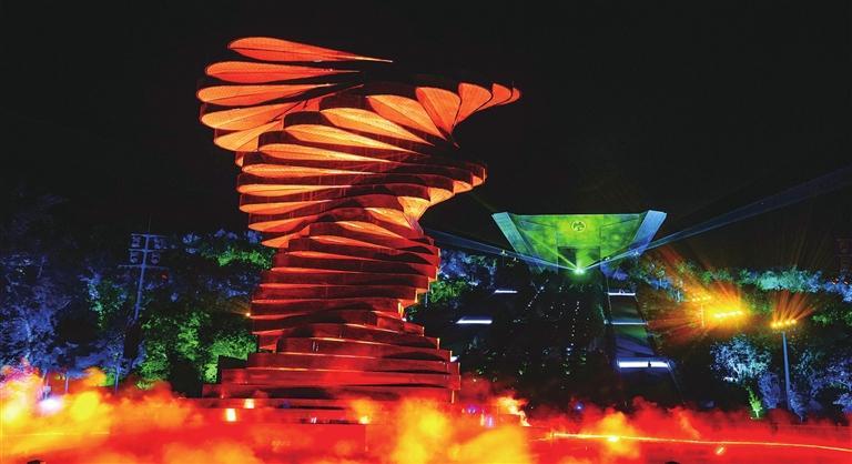 秋日的金川國家礦山公園樂聲悠揚、光影迷離。夜晚,伴隨著動人的旋律,絢爛的光影投射到主界碑“龍首魂”上,金昌元素生動地展現(xiàn)在眼前,“鎳都之光”文化展演為旅客帶來了一場視覺盛宴。