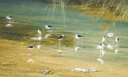 4月9日,一群黑翅長腳鷸在定西湖水面飛行。進(jìn)入4月,候鳥陸續(xù)北遷,定西湖成了眾多鳥群遷徙途中的歇腳補(bǔ)給地。新定西·定西日?qǐng)?bào)記者 牛小棟 攝