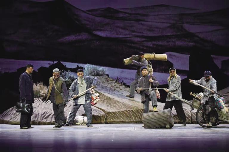 話劇《八步沙》別具匠心地從自然、歷史、人生三項(xiàng)維度,展現(xiàn)“六老漢”的奮斗歷程,再現(xiàn)“六老漢”三代人治沙的感人故事。劇中人物形象鮮明,表演真實(shí),質(zhì)樸感人,劇情節(jié)奏一氣呵成,舞美簡(jiǎn)潔大氣,轉(zhuǎn)場(chǎng)巧妙,充滿戲劇沖突和懸念。