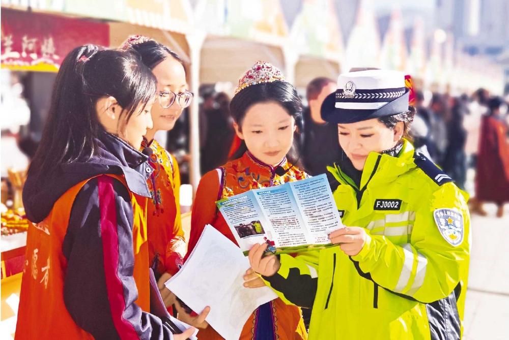 民警向群眾講解交通安全知識。11月27日,廣河縣公安局交管大隊民警走進齊家文化廣場,利用戲曲進鄉(xiāng)村文藝匯演的有利契機開展交通安全系列宣傳活動。新甘肅·甘肅法治報通訊員 汪洋 攝