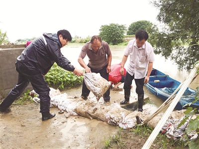 7月13日,江蘇省宜興市丁蜀鎮(zhèn)紀(jì)檢干部到該鎮(zhèn)雙廟村防汛一線,在督促履行抗洪搶險(xiǎn)職責(zé)的同時(shí),與當(dāng)?shù)馗刹咳罕娨坏兰庸毯拥?。毛光?nbsp;攝