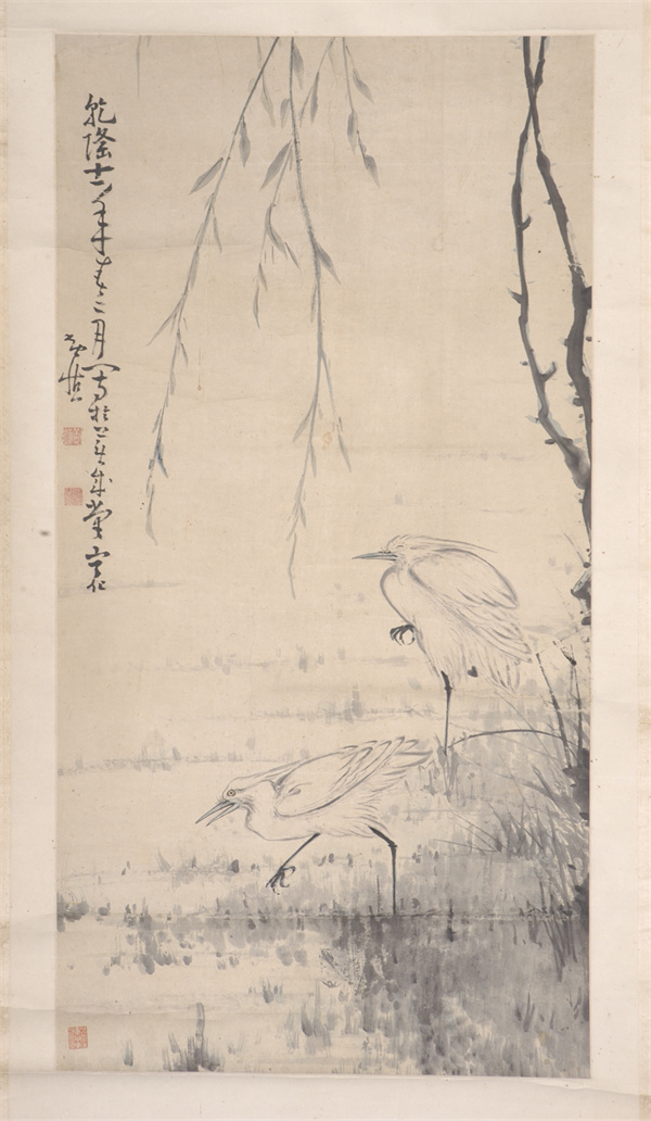 清代,水墨設(shè)色花鳥畫立軸,紙本,作者黃慎。縱高1126厘米,橫寬57.4厘米??钍?ldquo;乾隆十一年春二月寫于蕪成堂寧化黃慎”。鈐“黃慎”白文方印,“癭瓢”白文方印。柳枝自畫面上方垂下,疏落的柳葉隨風(fēng)搖曳。池塘兩只白鷺,一只閉目獨(dú)立,一只行走覓食。黃慎,福建寧化人,書畫家,為“揚(yáng)州八怪”之一。