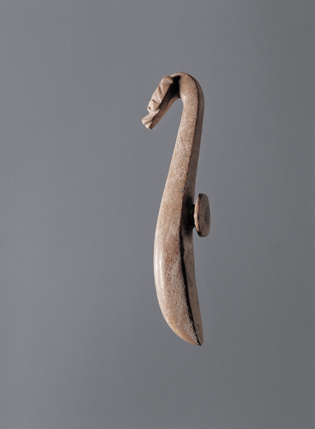 漢代,武威市雷臺漢墓出土。長10厘米,寬1.5厘米,厚2.7厘米。青玉,淺浮雕。鉤首雕成龍頭形,高而窄,鉤肚圓鼓,背有一圓鈕。帶鉤是古代服飾配件,兼有實用和裝飾的雙重作用,材質(zhì)多樣,工藝繁簡各異。