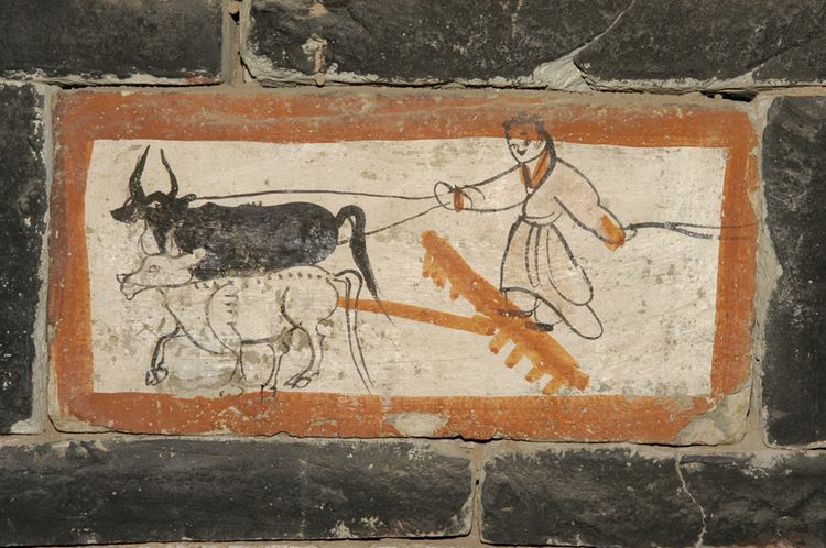 魏晉時(shí)期,嘉峪關(guān)市新城魏晉5號(hào)墓出土。長(zhǎng)35.5厘米,寬17厘米。磚呈長(zhǎng)方形,白粉涂底,土紅色勾勒邊框,墨線描繪,紅、黑色敷彩。畫(huà)面繪一男子身著紅領(lǐng)右衽長(zhǎng)袍,左手持鞭,右手持繩,站于二牛抬杠耙上耙地。黑?;厥追搭?,白牛用力前行,共拉紅色齒耙。
