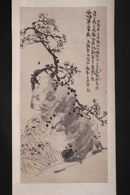 清代,水墨花鳥畫立軸,吳昌碩、王一亭合作,紙本。縱128.5厘米,橫63.3厘米??钍?ldquo;乙卯春一亭種水仙搬頑石,吳昌碩補(bǔ)梅并題”;鈐“缶翁”白文方印、“一亭父”朱文方印。構(gòu)圖險奇,巨石斑駁渾厚,梅樹老干椏槎(chá),鐵骨錚錚,新枝旁出,穿插于其間,凌空屈曲,花開數(shù)朵,疏落有致,石旁水仙茂盛,纖塵不染。吳昌碩、王一亭合璧之作。