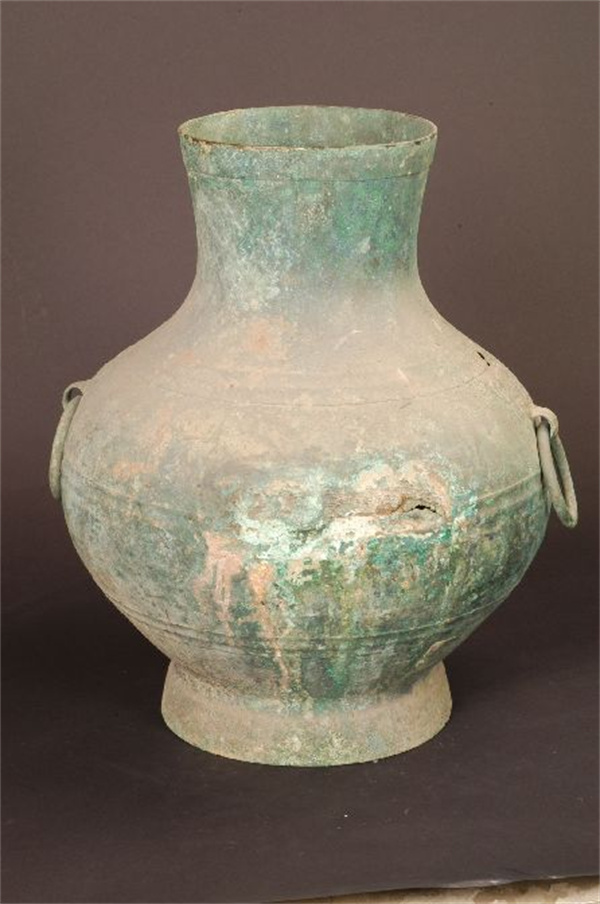 漢代,武威雷臺(tái)漢墓出土。高44.2厘米,口徑18.1厘米,底徑21.9厘米。直口,圓腹,假圈足,腹部有三組瓦紋和對(duì)稱的兩個(gè)獸面銜環(huán)輔首,腹上部篆書“巨李鍾”三字。李,姓氏。《說文•金部》:“鐘,酒器也。從金,重聲。”