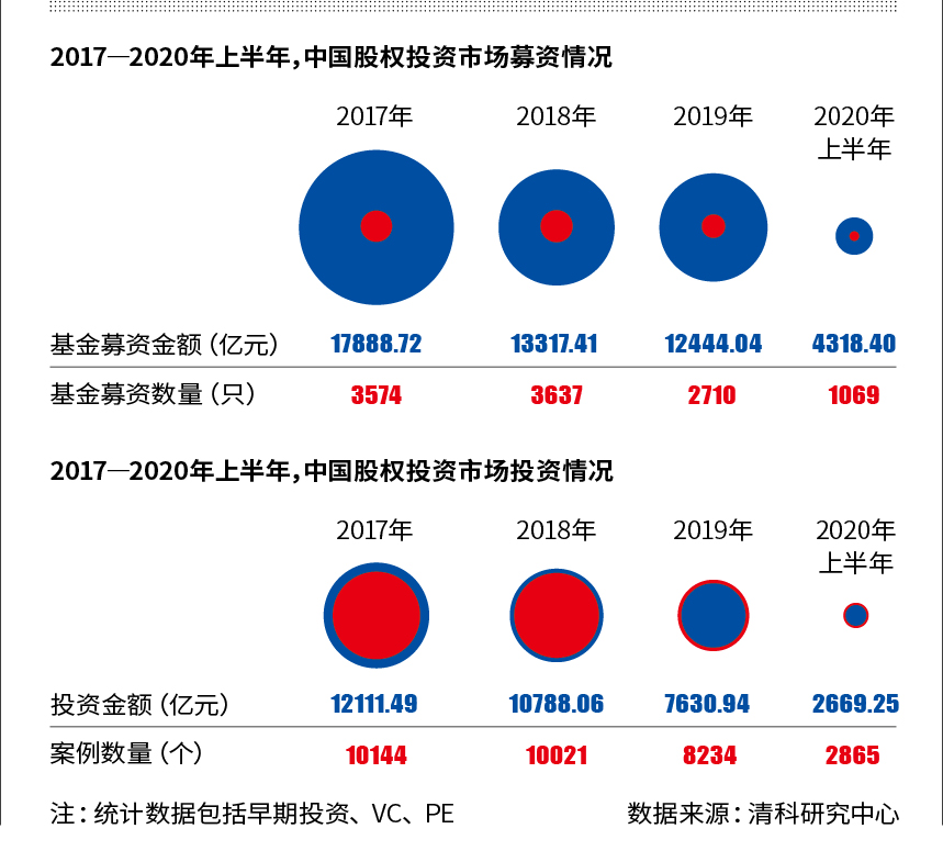 從清科研究中心公布的數(shù)據(jù),亦可窺見2020年上半年募資難與投資緊的全貌。該研究中心數(shù)據(jù)顯示,2020年上半年市場共有1069只基金完成新一輪募集,金額總計4318.40億元人民幣,同比下降29.5%;市場共發(fā)生2865起投資事件,涉及金額2669.25億元,同比分別下滑32.7%、21.5%。
