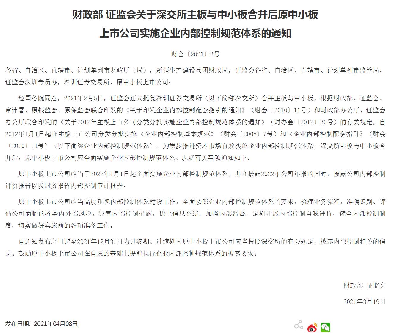 通知明確,原中小板上市公司應當于2022年1月1日起全面實施企業(yè)內(nèi)部控制規(guī)范體系,并在披露2022年公司年報的同時,披露公司內(nèi)部控制評價報告以及財務報告內(nèi)部控制審計報告。