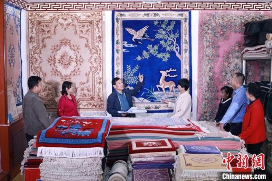 8月底,甘肅地毯制作手藝人李建輝(左三)介紹手工地毯文化。豆苗 攝