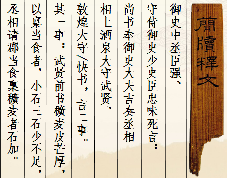 此簡為漢宣帝回復(fù)酒泉太守“辛武賢”和敦煌太守“快”奏疏的恩準(zhǔn)詔書,簡文記載的是皇帝詔書中對兩太守奏疏內(nèi)容的復(fù)述。從簡文內(nèi)容看,酒泉太守辛武賢和敦煌太守快給朝廷的奏疏主要涉及兩件事情:一是辛武賢認(rèn)為作為糧草的穬麥因皮厚芒長,如按規(guī)定每人發(fā)放小石三石,會造成實際數(shù)量的不足,所以他請求皇帝每石加發(fā)若干。另一件事顯然是敦煌太守快的上書,但文字未能容納于此簡,故不得而知。