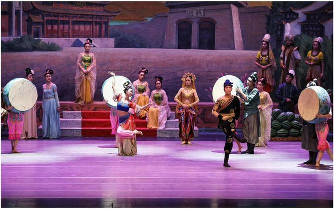 舞劇《絲路花雨》取材于敦煌莫高窟壁畫藝術(shù),融合了中國古典舞、印度舞、黑巾舞、波斯馬鈴舞、波斯酒舞、土耳其舞、盤上舞、新疆舞等各種藝術(shù)形式。該劇首創(chuàng)于1979年,甘肅省歌舞劇院于2008年修排了新版《絲路花雨》,并不斷進(jìn)行創(chuàng)新。