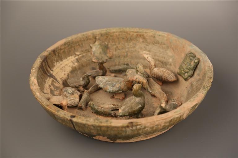 綠釉陶陂池高15厘米,口32厘米,底16厘米,為蘭州市博物館館藏三級(jí)文物。陶陂池內(nèi)有形象生動(dòng)的鴨、鵝、龜、青蛙等造型,代表墓主人生前擁有這樣一份家產(chǎn)。陂池,指在自然坡地筑堤蓄水澆灌農(nóng)田的池塘、澤沼。我國興修陂池的歷史很早,傳說夏禹治水時(shí),曾從事“陂九澤”的工程。利用地勢蓄水灌溉,在古代較為普遍,尤其在漢代時(shí)陂池工程得到較大發(fā)展。陂池養(yǎng)魚、家禽、種藕、種菱角、養(yǎng)龜,不僅可提高農(nóng)民的經(jīng)濟(jì)收入,豐富人們的食物來源,還可以起到美化環(huán)境、凈化水質(zhì)的作用,青蛙、田螺自由生存,起到平衡自然生態(tài)的作用。