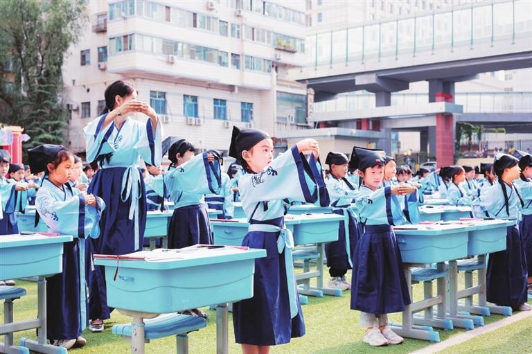 中國(guó)甘肅網(wǎng)9月2日訊 據(jù)蘭州晨報(bào)報(bào)道(奔流新聞·蘭州晨報(bào)記者裴強(qiáng)) 8月30日,蘭州市七里河教育集團(tuán)為七里河小學(xué)和中車分校的600名一年級(jí)新生舉行入學(xué)“開(kāi)筆禮”儀式。開(kāi)筆禮在中國(guó)傳統(tǒng)文化中是對(duì)少兒識(shí)字習(xí)禮的稱謂,是標(biāo)志少兒進(jìn)入學(xué)習(xí)階段的重要紀(jì)念,是中國(guó)古代人生的首次大禮,孩子將要入學(xué)讀書(shū)寫(xiě)字、習(xí)禮之時(shí)的一個(gè)傳統(tǒng)禮節(jié)。兩所學(xué)校600名一年級(jí)新生“端正衣冠”“感恩先賢”“朱砂啟智”“擊鼓鳴志”“啟蒙描紅”,體驗(yàn)傳統(tǒng)“開(kāi)筆禮”儀式。