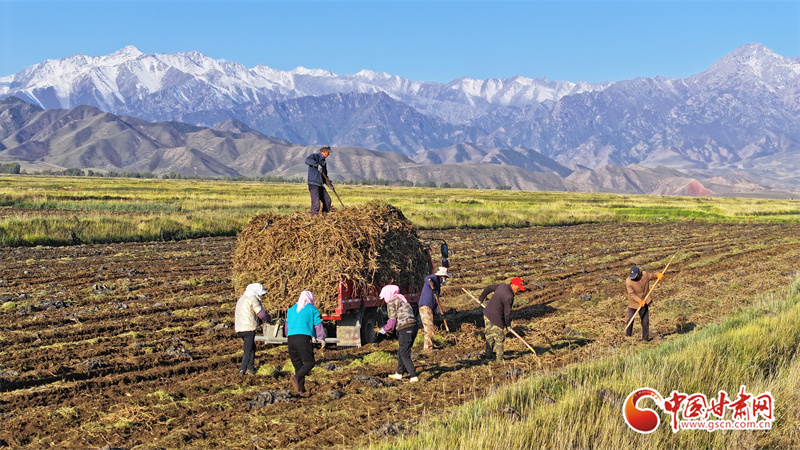 10月7日,位于祁連山腳下的張掖市民樂縣南豐鎮(zhèn)張連莊村的千畝黃芪種植基地,藥農(nóng)們忙著采收黃芪,田間地頭一派豐收的繁忙景象。