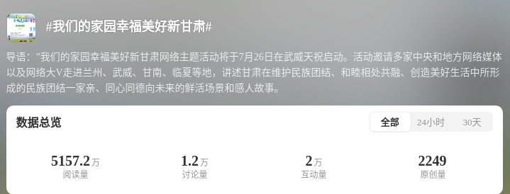 為深化互動引導,打造高流量IP,@甘肅網(wǎng)信、@快看甘肅等官方賬號發(fā)起社交平臺互動話題#我們的家園幸福美好新甘肅#。結(jié)合#厚道甘肅##萬千氣象看甘肅#等話題,@中新觀隴、@中國甘肅網(wǎng)、@甘肅好網(wǎng)民、@蘭州新區(qū)發(fā)布、@甘南融媒等賬號同步發(fā)力、同頻共振。目前,該話題總閱讀量超5530萬人次,討論互動量3.2萬人次。