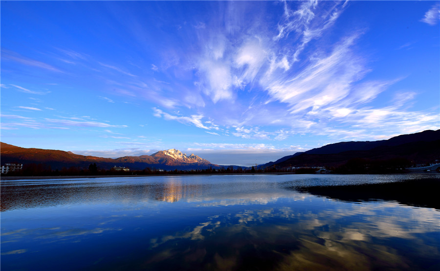 我是被亮光驚醒的。我和很多水從象山腳下的黑龍?zhí)睹俺鰜怼9具艘宦暦纤???匆姾芏嗖煌拥娜?。黑頭發(fā)的人,黃頭發(fā)的人。黑眼睛的人,藍(lán)眼睛的人。我看見了潭邊的亭臺(tái)樓閣??匆娏嘶ㄅc樹。我還順著人們遠(yuǎn)眺的目光看見了玉龍雪山,晶瑩奪目矗立在藍(lán)天下面。潭水映照雪山,真讓人目眩神迷啊。人們在橋上,在堤上,說著不同的語言。在不同的語言里,都有那個(gè)詞頻頻出現(xiàn):麗江,麗江。這時(shí)的麗江已經(jīng)是一座很大的城了。城里也不是只有最初筑城的納西人了。如今全中國全世界的人都要來麗江,看納西古城的四方街,看玉龍雪山。