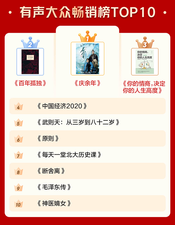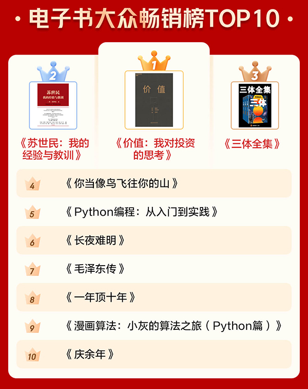 通過電子書暢銷榜TOP10和有聲暢銷榜TOP10可以看出,很多人愈發(fā)關(guān)注投資和管理等方面的內(nèi)容,也愈發(fā)注重個人學習?!秲r值:我對投資的思考》《蘇世民:我的經(jīng)驗與教訓》 分別位居電子書暢銷榜第一名和第二名?!吨袊?jīng)濟2020》《原則》進入有聲暢銷榜前十。此外,學習類圖書《Python編程:從入門到實踐》《漫畫算法:小灰的算法之旅(Python篇)》也上榜電子書暢銷榜前十。