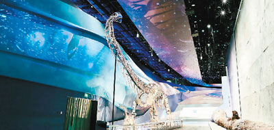 武漢自然博物館展示的中加馬門溪龍化石、硅化木和“龍”足跡化石墻。 本文圖片均由長(zhǎng)江文明館(武漢自然博物館)提供