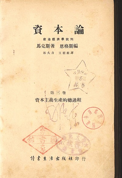人大圖書館還藏有郭大力、王亞南翻譯的中國首個《資本論》全譯本的初印本。這是毛澤東同志贈送的,封面鈐有“毛澤東”簽名章。