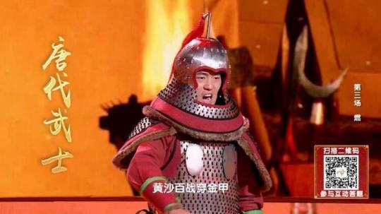“王于興師,修我甲兵,與子偕行”是統(tǒng)一六國的秦代武士;“戎馬鳴兮金鼓震,壯士激兮忘身命”是平定邊患的漢代武士;“黃沙百戰(zhàn)穿金甲,不破樓蘭終不還”是萬里長征的唐代武士;“壯志饑餐胡虜肉,笑談渴飲匈奴血”是直搗黃龍的宋代武士。這幾位武士代表堪稱《中國詩詞大會》“史上最強(qiáng)出題天團(tuán)”,為選手們帶來超燃的題目。
