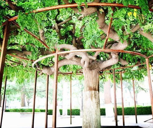 博物館里的這兩棵龍爪槐分別種植在展覽大樓前的東西兩角,是博物館的老專家郭維屏先生所種植。1959年秋冬,甘肅省博物館從通渭路舊館搬遷到七里河的新館,新館內(nèi)一片荒涼,亟待綠化。而就在此時,郭維屏老先生調(diào)入博物館工作,參與到館內(nèi)的綠植規(guī)劃建設(shè),也正好發(fā)揮自己的藝術(shù)特長。這兩棵龍爪槐的幼株是郭老先生從五泉山苗圃選購的,栽種到展覽大樓前院的東西兩角,槐樹的周圍還設(shè)計了幾個形狀不一的花壇,花壇內(nèi)種植了各色各樣的樹木,一眼望去郁郁蔥蔥,生機(jī)盎然,頗有些韻味。這兩棵龍爪槐剛栽種時體型嬌小,看起來很不起眼。經(jīng)過郭老先生和博物館幾代人的悉心栽培,如今已是樹冠優(yōu)美,花香四溢。每到槐花盛開的時候,滿庭飄香,沁人心扉,成了博物館里一道靚麗的景色,引得路人駐足欣賞。東角的龍爪槐高約2米,樹干粗達(dá)2尺多,樹冠如傘,頂端長出八、九個主枝向四面伸展,屈曲盤繞,而后又分為數(shù)十個中枝和數(shù)百個小枝,互相攀援,屈折如爪,一枝獨(dú)秀。而西角的龍爪槐因基建的原因長勢受到一定影響。