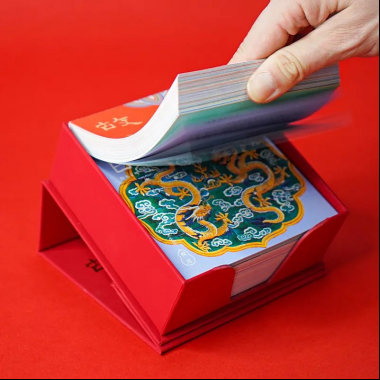 如意取出第一層里紅紅的燙金書刊盒,馬上發(fā)現(xiàn)了它的小機關(guān):原來盒蓋上有個吸鐵石,把它翻過來,就可以25度傾斜地放在書桌上,舒服地翻閱一整年的“日子”;每一天的頁面都能被絲滑地撕下,作為小書簽,插在課本讀物中。