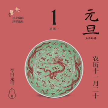 翻開新年伊始的“元旦”頁,映入眼簾的是一個綠色的盤子,上面有三條雄勁矯健的“龍爺爺”,它們來自清代吧!如意輕輕撕下日歷頁翻到反面,讀起文物小故事:“我是淡綠地礬(fán)紅彩云龍紋盤……”