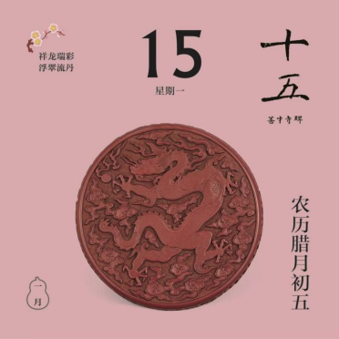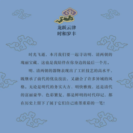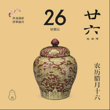 翻開1月月份頁,首先跳入眼簾的,是主題詞“祥龍瑞彩”。這個月以絢麗的顏色為主線,串起各色龍文物,比如精致的宋代單色釉龍紋盤,絢麗的故宮官式建筑和璽彩畫,還有優(yōu)雅的清代掐絲琺瑯游龍花卉紋瓜式蓋罐……
