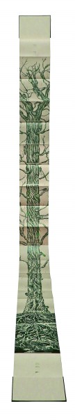 除了材料語言的拓展,展覽中的許多作品還展現(xiàn)出設(shè)計形式的創(chuàng)新與突破。如陳潔瑩的《蟬鳴樹語》聚焦了蟬絢爛而短暫的生命軌跡。書籍的裝幀方式采用經(jīng)折裝,當(dāng)書本徐徐展開,一棵參天古樹好似拔地而起,貫通全書首尾。由樹根處為起點向上閱讀直至樹冠,可見蟬從卵枝到若蟲,再經(jīng)歷脫殼變?yōu)槌上x的歷程。經(jīng)由巧妙的形式設(shè)計,生命的輪回在書頁間流轉(zhuǎn),詮釋出動人的自然之力。