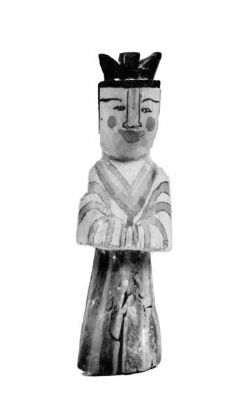 這個木俑,打扮著一副明星相:她雙手執(zhí)禮,頭發(fā)結(jié)為三環(huán)髻。工匠們只是簡單地雕刻出了木俑的大體形狀。然后用墨線勾勒出了眉、眼、鼻,用紅色裝飾出鼻梁、嘴唇、臉頰;又用紅黑兩色繪制出衣服。