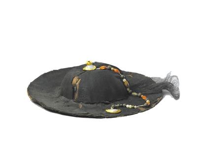 這一頂鑲寶石鈸笠帽,可要豪華貴重得多,這是一頂帽頂垂有一串玉石珠串飾的帽子,帽的直徑有35厘米?!洞笤湔隆吩涊d有人搶走蔡國祥懸有紅瑪瑙珠串的棕帽的事??梢娒鄙洗勾椧彩窃F族的風氣。這種帽子的流行始于元成宗大德年間(1297—1307),一個商人賣給官府一塊紅剌子(紅寶石)重一兩三錢,用于鑲嵌帽頂。從此以后,歷代皇帝相承。凡元旦及天壽節(jié)大朝賀時都戴這種鈸笠帽。漳縣元代汪世顯墓出土的這頂鈸笠帽,帽頂鑲金裹玉,由帽頂垂系31顆珠玉組成的串練。以珠玉寶石來裝飾帽子,帽子的價值之高昂自不待言。