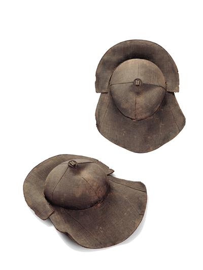 先看前加沿笠帽,大家看是不是有些眼熟?沒錯,這頂帽子與影視劇中英雄俠客們所戴的帽子很相似,《神探狄仁杰》里的李元芳、《水滸》中的林沖外出時就戴類似的帽子。為什么要戴這樣的加沿笠帽呢?為了遮光啊。別小瞧這頂前加沿笠帽,它的背后還有一段歷史故事呢:相傳元世祖忽必烈騎馬射獵時覺得日光太過炫目,聰慧體貼的皇后便為他設計了這種前面加沿的帽子,戴這種加沿帽遮光效果就好多了,忽必烈非常喜歡,便將這種式樣固定了下來,以后國人紛紛效仿,成為流行款式??墒?,唐宋是在元之前,元芳和林沖似乎不該戴類似的帽子?既是藝術形象,就不用深究了吧。人類智慧相通,英雄更是惺惺相惜,既都是英雄,戴上同款的帽子也是應有之義。