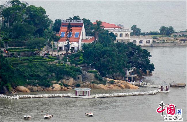 如果有這樣一座島嶼——遠(yuǎn)處是一方寧靜的藍(lán)天,近處是一片幽深的綠樹,藍(lán)與綠之間,是逶迤而去的清水紅磚……極目遠(yuǎn)眺,只見她濃淡相宜、遠(yuǎn)近相安,仿佛一幅肅穆祥和的印象派油畫;細(xì)細(xì)聆聽,似乎還有一支悠揚(yáng)的鋼琴曲,在伴隨海鷗與濤聲,不時從畫中飄來……