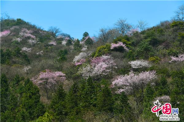 沿著蜿蜒的旅游公路,兩旁海拔600多米的山坡上開滿了櫻花,一簇簇櫻花投印在蒼翠山麓與柳綠間,潔白的、粉色的、玫紅的花朵,迎風(fēng)搖曳,儼然一副七彩水墨畫。