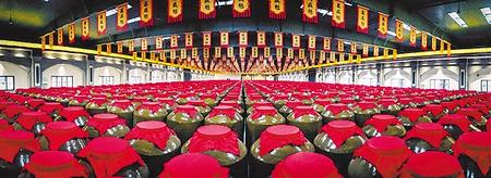 來到養(yǎng)酒館的三樓,這里儲存了大量的陶壇,它們整齊有序地擺放著,在陶壇上面懸掛著徽縣歷史上幾十家著名的老字號釀酒作坊的名號。“不要小看這些陶壇,它們里面可裝著金徽的‘寶貝’。”講解員說,這里面承裝著金徽的老酒,也是高端酒。每一壇都有標簽,注明了年份。